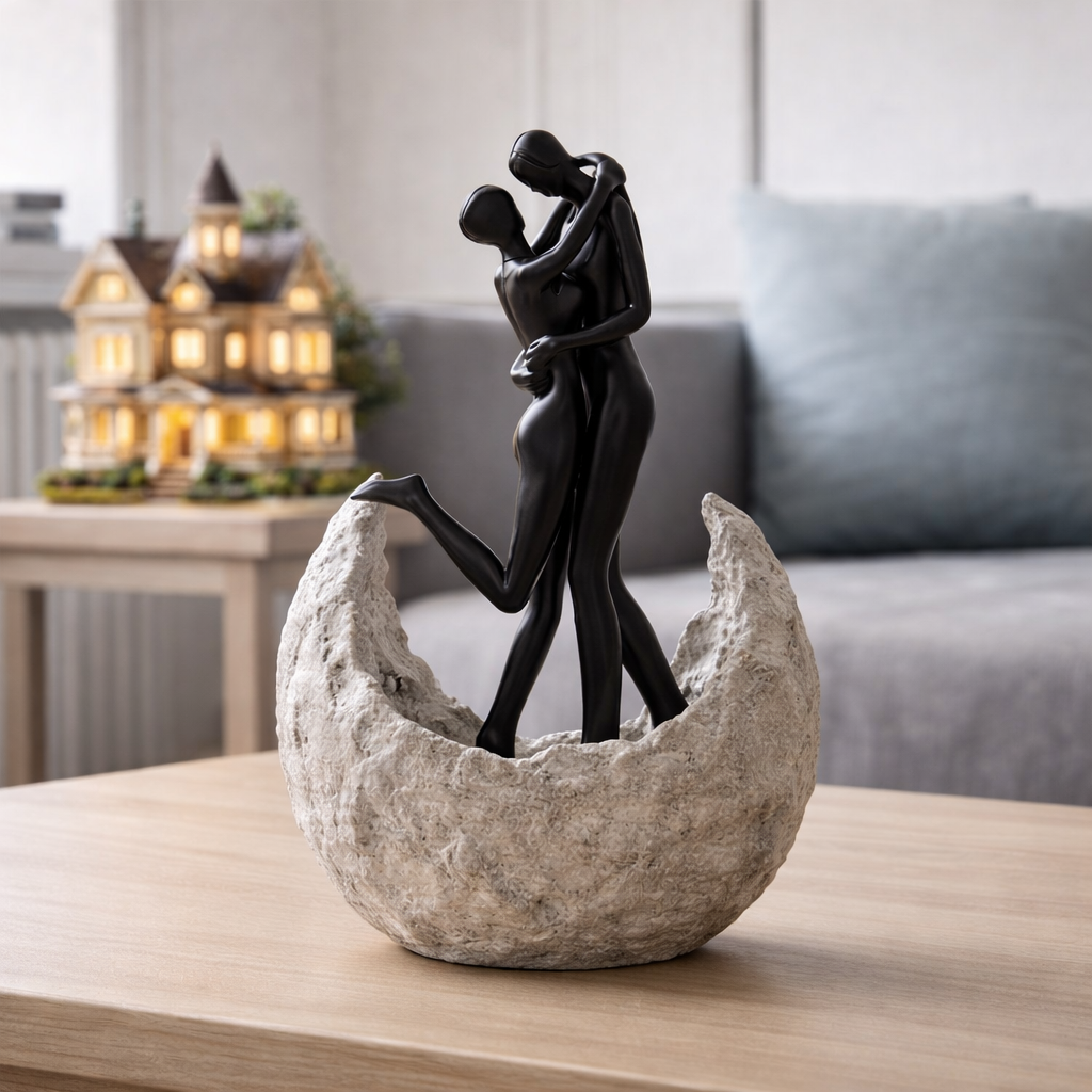 This stunning sculpture portrays a couple locked in a tender embrace, standing gracefully atop a textured crescent moon base. The contrast between the sleek black figures and the soft, stone-like white moon creates a visually striking harmony that symbolizes balance—light and dark, strength and softness, individuality and unity. It is not just décor; it is a visual representation of love that feels grounded yet dreamy.