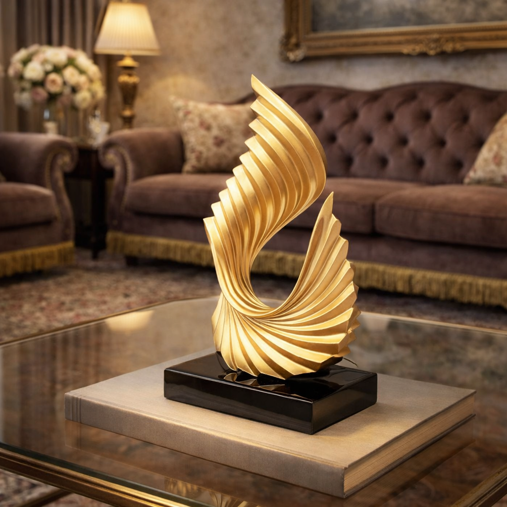 The sculptural design features a mesmerizing twist that creates a dynamic visual effect, drawing the eye from every angle. Finished in a rich golden tone, the piece reflects light beautifully, adding warmth and depth to your interiors. Whether placed on a coffee table, console, or office desk, it instantly enhances the ambiance with a luxurious charm.